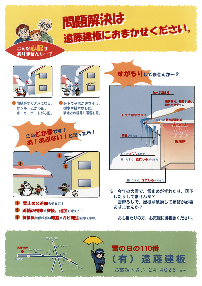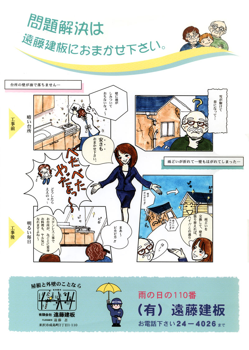 遠藤建板は、米沢市で「お住まいの屋根・外壁・雨樋」の工事を専門にしている会社です。